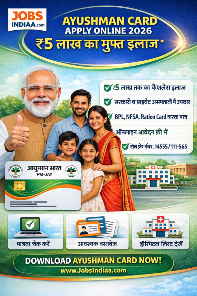 वर्ष 2026 में आयुष्मान कार्ड के लिए ऑनलाइन आवेदन करना एक सरल और सुविधाजनक प्रक्रिया है। इसके माध्यम से पात्र व्यक्ति प्रधानमंत्री जन आरोग्य योजना (PM-JAY) के अंतर्गत ₹5 लाख तक का मुफ्त स्वास्थ्य बीमा प्राप्त कर सकते हैं। नीचे ऑनलाइन आवेदन प्रक्रिया को आसान बनाने के लिए एक स्टेप-बाय-स्टेप मार्गदर्शिका दी गई है।