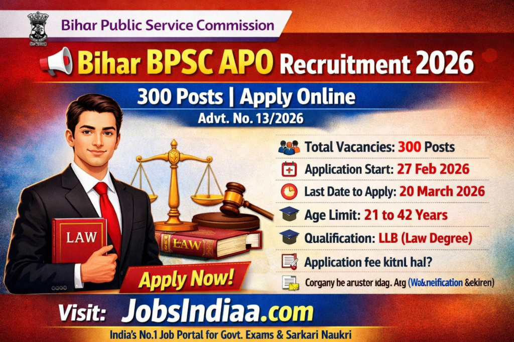 Bihar Public Service Commission द्वारा जारी Bihar BPSC APO Recruitment 2026 (Advt. No. 13/2026) Law graduates के लिए एक शानदार सरकारी अवसर है। कुल 300 पदों पर भर्ती निकाली गई है, जिससे प्रतियोगिता भी अच्छी होगी और चयन के अवसर भी मजबूत हैं।