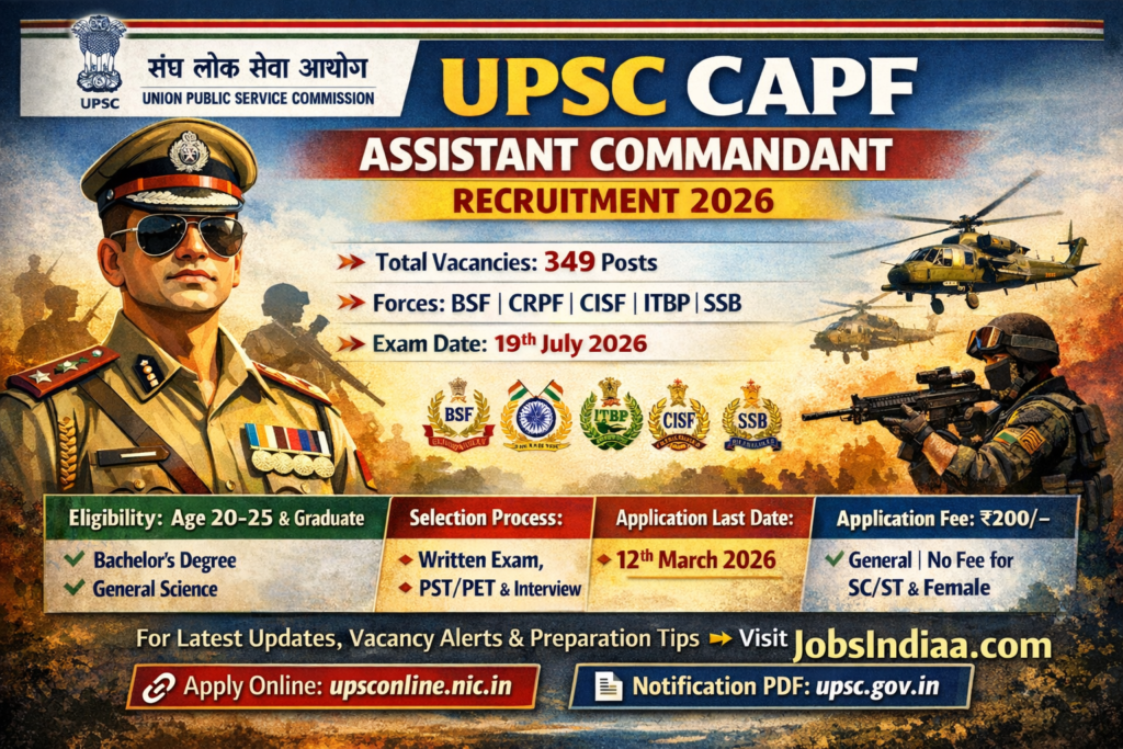 UPSC CAPF Assistant Commandant Recruitment 2026 notification has been officially released for 349 vacancies in BSF, CRPF, CISF, ITBP and SSB forces. Candidates aged 20–25 years with a Bachelor’s degree can apply online before 12 March 2026. Check complete eligibility, exam pattern, fee details and direct apply link below.