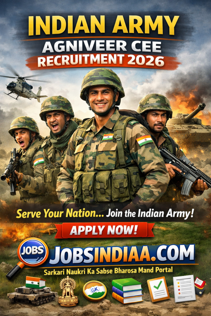Indian Army Agniveer CEE Recruitment 2026 un sabhi candidates ke liye ek bada mauka hai jo Indian Army join karna chahte hain. Agar aap desh ki seva karna chahte hain to is opportunity ko miss na karein.इन सभी की पूरी और सटीक जानकारी के लिए रोज़ाना विजिट करें JobsIndiaa.com