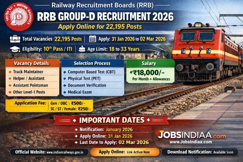 In this article, you will find complete details about RRB Group-D Recruitment 2026, including vacancy details, eligibility criteria, age limit, selection process, salary, important dates, and how to apply online — all presented in a jobsindiaa.com.